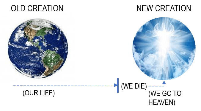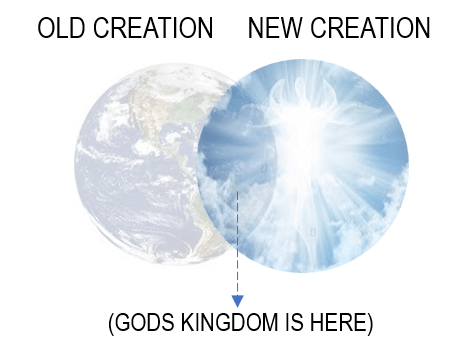 His purpose was to introduce us to God’s Kingdom. Somewhere along the way, we have missed it. Our faulty understanding is that we live in the “old creation” and broken world, slugging through it throughout our life, performing as best we can, in the hope that when we die we go to heaven. Then we will be able to experience the freedom that Jesus claimed for us. This is illustrated below.