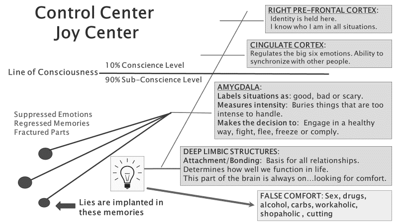 God created our brains to have a healthy identity. The brain’s control center (sometimes referred to as the joy center) not only regulates motivation, it regulates emotion in a way that keeps us “ourselves” in all situations. The main emotions the control center regulates are joy and the big six unpleasant emotions: fear, anger, sadness, disgust, shame, and hopelessness.